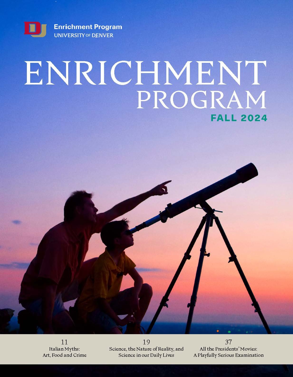 The Enrichment Program, established in 2003, connects the intellectually curious adult to DU's outstanding faculty, facilities, and programming, and Denver's rich cultural community through non-credit courses. Short evening and weekend classes provide opportunities to explore a wide range of subjects - from history and contemporary issues to science, literature, and the arts - without the pressures of exams, grades, or admission requirements.